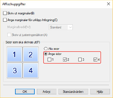 [Affischuppgifter]-dialogrutan > [Sidor som ska skrivas ut] > [Ange sidor]: [2] och [4]