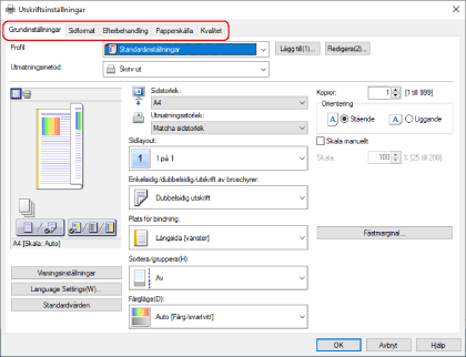 OBS!Om den funktion som du vill använda inte visas på utskriftsinställningsskärmen konfigurerar du utskriftsinställningarna efter att ha aktiverat funktionerna i enheten genom att hämta enhetsinformationen etc.
