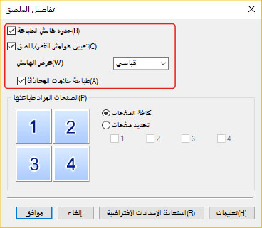 عند الطباعة مع الخطوط الحدودية أو عند ضبط الهوامش أو نطاق الصفحات التي ستتم طباعتها، قم بتنفيذ الإجراء التالي.