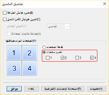 مربع الحوار [تفاصيل الملصق] > [الصفحات المراد طباعتها] > [تحديد صفحات]: [2] و [4]
