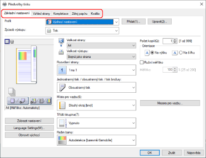 POZNÁMKAPokud funkce, kterou chcete použít, není na obrazovce s nastaveními tisku zobrazená, nakonfigurujte nastavení tisku po povolení funkcí zařízení získáním informací o zařízení atd.