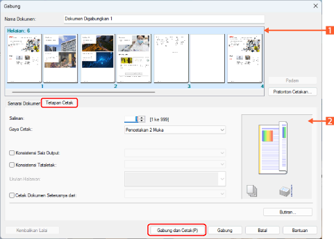 Anda boleh menggabungkan berbilang fail menjadi satu fail dan mencetaknya. Anda boleh menukar tetapan cetakan untuk mengedit fail yang digabungkan menggunakan Canon PageComposer.