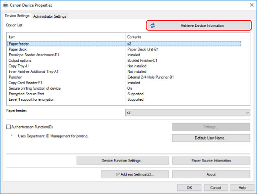 When installing a driver with a network connection, normally, information about options installed in the device is retrieved and functions associated with the driver are set so that they can be used. When the functions of the device cannot be used, or when an option is added, the device information must be reacquired and the option structure manually set.