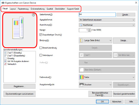 Die aktuellen Einstellungen sind in der Vorschau dargestellt. Durch Anklicken der Vorschau können Sie grundlegende Druckfunktionen wie doppelseitiger Druck, Bindeposition, Seitenlayout usw. einstellen.