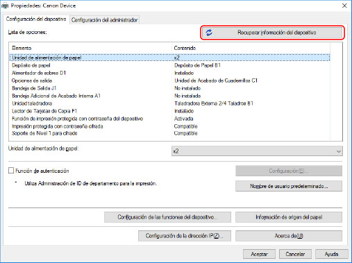 Cuando se efectúa la instalación mediante una conexión de red, normalmente la información sobre las opciones instaladas en el dispositivo se recupera y se configuran las funciones asociadas al controlador para que puedan utilizarse. Cuando las funciones del dispositivo no se puedan utilizar, o cuando se agregue una opción, se debe volver a adquirir la información del dispositivo y configurar la estructura de opciones de forma manual.