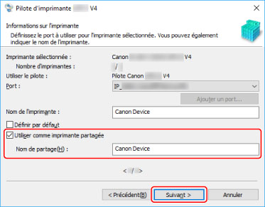 Sélectionnez [Utiliser comme imprimante partagée] → modifiez [Nom de partage] si nécessaire → cliquez sur [Suivant].