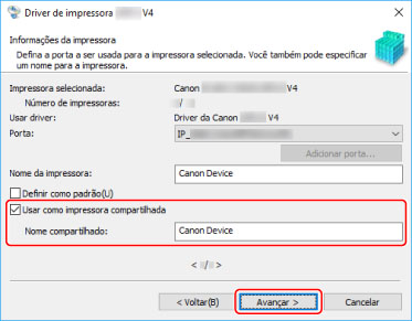 Selecione [Usar como impressora compartilhada] → altere [Nome compartilhado] se necessário → clique em [Avançar].
