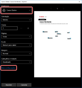 Se a tela de configurações de impressão padrão do Windows, que é diferente da tela acima, for exibida, isto pode ser devido a um erro no ambiente, configurações ou o estado de instalação do driver. Consulte a solução de problemas para ativar a tela de configurações de impressão do driver a ser exibida.