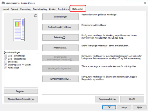 Hvis standardvinduet for utskriftsinnstillinger i Windows, som ikke har et [Støtte/enhet]-ark, vises, kan det oppstå et problem med miljøet, innstillingene eller installasjonsstatus for driveren. Se etterfølgende informasjon om feilsøking hvis du vil aktivere at utskriftsskjermen i driveren skal vises.