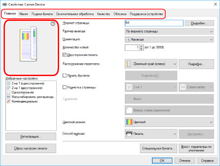 В окне предварительного просмотра показаны текущие настройки. Щелкнув в окне предварительного просмотра, можно настроить основные функции печати: двухстороннюю печать, расположение переплета, макет страницы и т. п.
