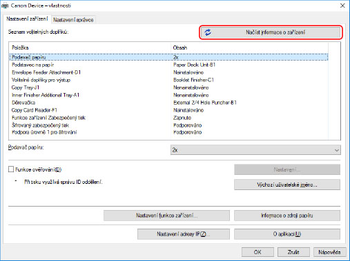 Při instalaci ovladače, když je tiskárna připojena k síti, se obvykle načtou informace o volitelných doplňcích nainstalovaných v zařízení a funkce související s ovladačem se nastaví tak, aby šly používat. Pokud funkce zařízení nelze používat nebo po přidání volitelného doplňku, musí být informace ze zařízení načteny znovu a struktura volitelných doplňků se musí nastavit ručně.