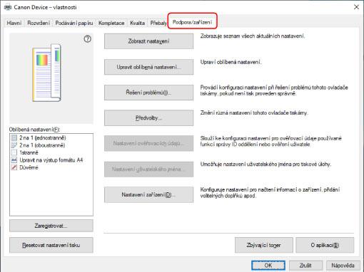 Pokud se zobrazí standardní obrazovka nastavení tisku systému Windows, která nemá kartu [Podpora/zařízení], důvodem může být chyba prostředí, nastavení nebo stav instalace ovladače. Informace o povolení zobrazení obrazovky nastavení tisku ovladače najdete v následujícím řešení potíží.