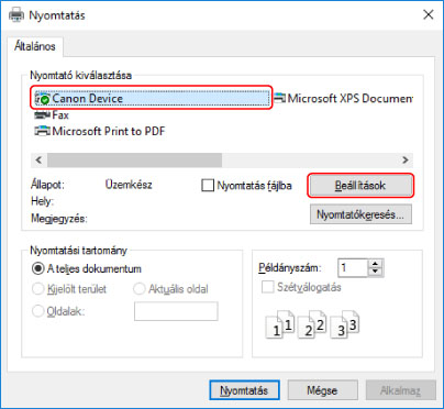 A nyomtatási képernyőn válassza ki a használt eszközt → kattintson a [Beállítások], a [Nyomtató tulajdonságai] vagy a [Tulajdonságok] elemre.