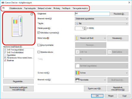 Az előnézetben a jelenlegi beállítások láthatók. Az előnézetre való kattintással beállíthatja az alapvető nyomtatási funkciókat, például a kétoldalas nyomtatást, a fűzési pozíciót, a lap elrendezését, stb.