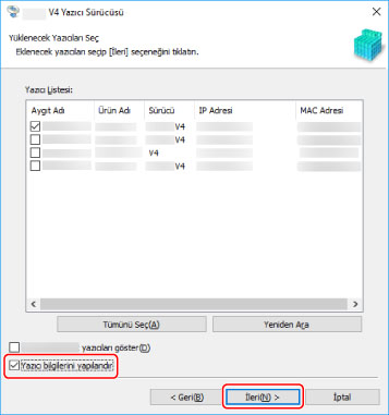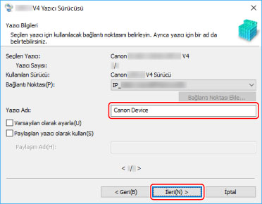 Aygıtın adını değiştirmek veya aygıtı varsayılan aygıt olarak ayarlamak isterseniz, [Yazıcı bilgilerini yapılandır] öğesini seçin → [İleri] düğmesini tıklatın.