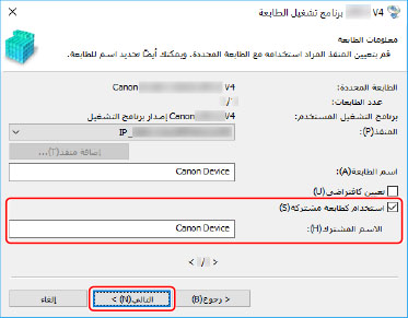 اختر [استخدام كطابعة مشتركة] ← قم بتغيير [الاسم المشترك] إذا لزم الأمر ← انقر [التالي].