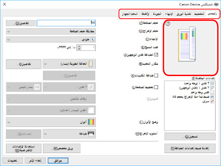 تم توضيح الإعدادات الحالية في المعاينة. بالنقر على المعاينة، يمكنك ضبط وظائف الطباعة الرئيسية مثل الطباعة على الوجهين أو مكان التجليد أو تخطيط الصفحة وما إلى ذلك.
