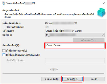 หากต้องการเปลี่ยนชื่ออุปกรณ์หรือตั้งค่าให้เป็นอุปกรณ์เริ่มต้น ให้เลือก [กำหนดค่าข้อมูลเครื่องพิมพ์] → คลิก [ถัดไป]