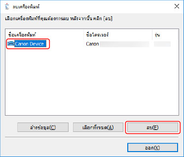 เลือกชื่อของอุปกรณ์ที่คุณต้องการถอนการติดตั้ง → คลิก [ลบ]