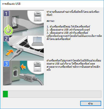 [ข้าม]: หากเชื่อมต่ออย่างถูกต้องด้วย USB คุณจะสามารถติดตั้งให้เสร็จได้ในหน้าจอนี้โดยไม่ต้องรอการดำเนินการให้เสร็จโดยอัตโนมัติ