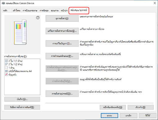 ถ้าหน้าจอตั้งค่าการพิมพ์มาตรฐานของ Windows ซึ่งไม่มีหน้า [สนับสนุน/อุปกรณ์] ปรากฏขึ้น แสดงว่าอาจเกิดจากข้อผิดพลาดในสภาพแวดล้อมการใช้งาน การตั้งค่า หรือสถานะการติดตั้งไดรเวอร์ ให้ดูที่หัวข้อการแก้ไขปัญหาถัดจากนี้เพื่อเปิดใช้งานการแสดงหน้าจอการตั้งค่าการพิมพ์ของไดรเวอร์