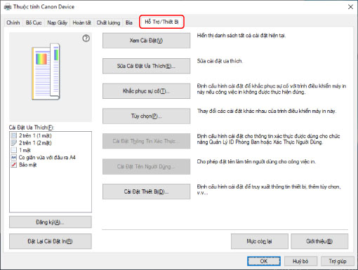 Nếu màn hình cài đặt in tiêu chuẩn Windows không có tờ [Hỗ Trợ/Thiết Bị] được hiển thị, có thể xảy ra vấn đề với môi trường, cài đặt hoặc tình trạng cài đặt của trình điều khiển. Tham khảo xử lý sự cố sau để bật màn hình cài đặt in của trình điều khiển cần hiển thị.