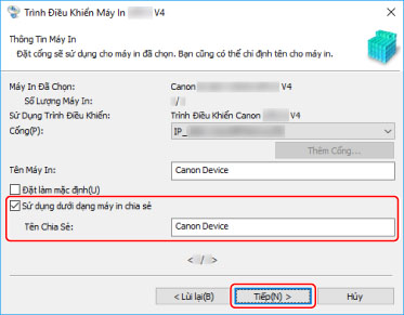 Chọn [Sử dụng dưới dạng máy in chia sẻ] → thay đổi [Tên Chia Sẻ] nếu cần → nhấp vào [Tiếp].