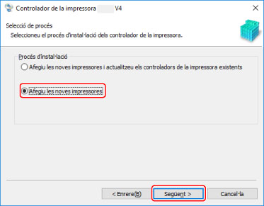 [Afegiu les noves impressores i actualitzeu els controladors de la impressora existents]: seleccioneu aquesta opció quan vulgueu actualitzar els controladors que ja estiguin instal·lats al mateix temps que hi afegiu un controlador nou.