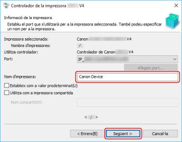 Si voleu canviar el nom del dispositiu o establir-lo com a dispositiu predeterminat, seleccioneu [Configura la informació de la impressora] → feu clic a [Següent].