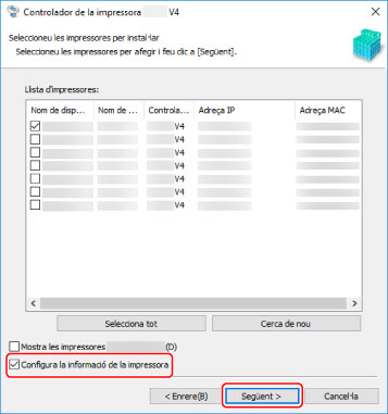 Seleccioneu el dispositiu que voleu instal·lar a la [Llista d'impressores].