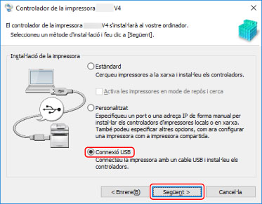 Seleccioneu [Connexió USB] → feu clic a [Següent].