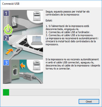 [Omet]: si heu establert una connexió correcta mitjançant USB, en aquesta pantalla podreu finalitzar la instal·lació sense haver d'esperar la compleció automàtica.
