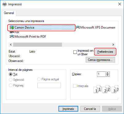 A la pantalla d'impressió, seleccioneu el dispositiu que estigueu utilitzant → feu clic a [Preferències], [Propietats de la impressora] o [Propietats].