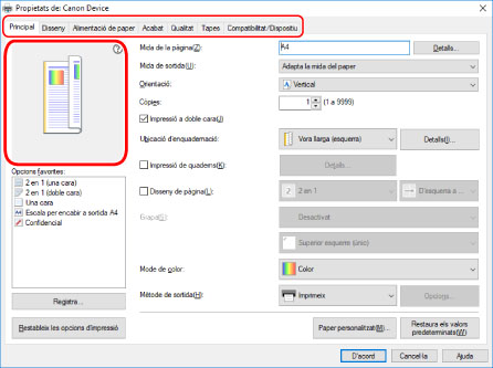 Les opcions actuals s'il·lustren a la vista prèvia. En fer clic a la vista prèvia, podeu configurar funcions bàsiques d'impressió com la impressió a doble cara, la ubicació de quadernets, el format de pàgina, etc.