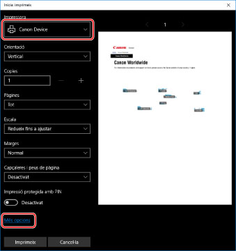 A la pantalla d'impressió, seleccioneu el dispositiu que estigueu utilitzant → feu clic a [Més opcions].