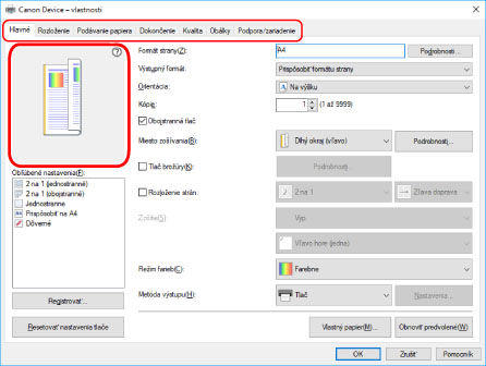 Aktuálne nastavenia sú zobrazené v predchádzajúcom náhľade. Kliknutím na náhľad môžete nastaviť základné funkcie tlače, ako je obojstranná tlač, miesto väzby, rozloženie strany atď.