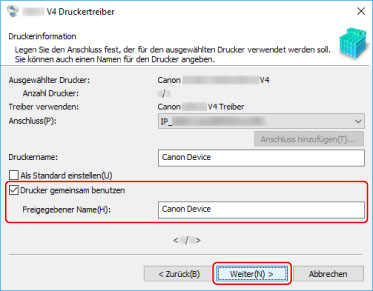 Wählen Sie [Drucker gemeinsam benutzen] → stellen Sie den Port unter [Anschluss] ein → klicken Sie auf [Weiter].
