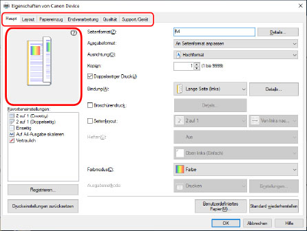 HINWEISWenn der Windows-Standardbildschirm für die Druckeinstellungen, der von dem oben dargestellten Bildschirm abweicht, angezeigt wird, kann ein Problem mit der Umgebung, den Einstellungen oder dem Installationsstatus des Treibers vorliegen. Unter Fehlersuche erfahren Sie, wie Sie den Bildschirm mit den Druckeinstellungen des Treibers aktivieren, damit er angezeigt wird.