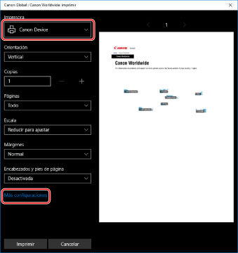 En la pantalla de impresión, seleccione el dispositivo que esté utilizando → haga clic en [Más configuraciones].