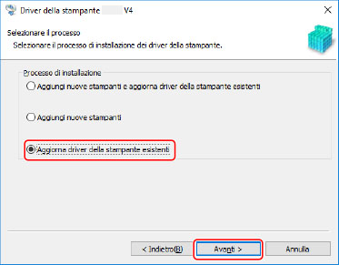 Selezionare [Aggiorna driver della stampante esistenti] → fare clic su [Avanti].