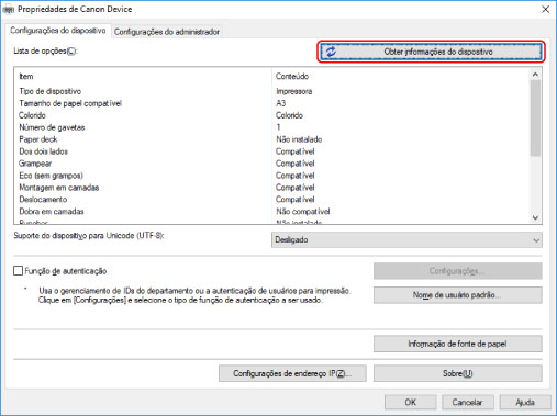 NOTAEm quaisquer dos seguintes casos, alguma informação de dispositivo não pôde ser obtida. Se aplicável, defina as opções manualmente.
