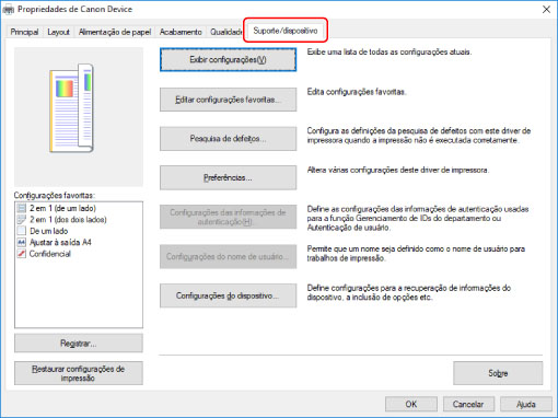 NOTASe a tela de configurações de impressão padrão do Windows, que não tem uma folha [Suporte/dispositivo], for exibida, pode haver um problema com o ambiente, configurações ou o estado de instalação do driver. Consulte a solução de problemas a seguir para ativar a tela de configurações de impressão do driver a ser exibida.