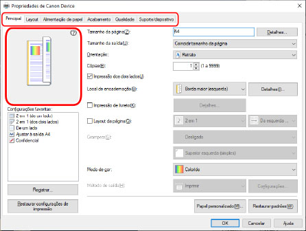 As configurações atuais são ilustradas na visualização. Clique na visualização, e você verá as funções de impressão básicas como impressão dos dois lados, local de encadernação, layout de página, etc.