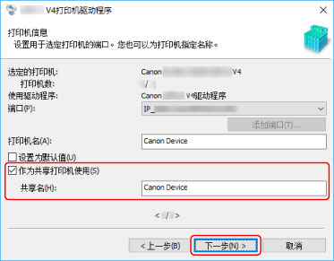 选择[作为共享打印机使用] → 在[端口]中设置端口 → 单击[下一步]。