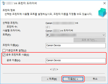 [공유 프린터로 사용] 선택 → [포트]에서 포트 설정 → [다음] 클릭.