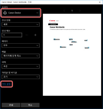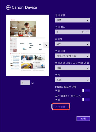 인쇄 화면에서 사용 중인 디바이스를 선택 → [기타 설정]을 클릭합니다.