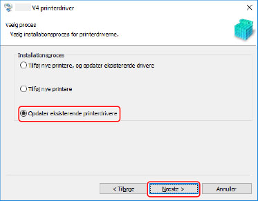 Vælg [Opdater eksisterende printerdrivere] → klik på [Næste].