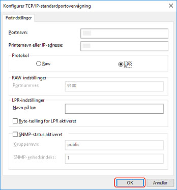 For at tilføje en TCP/IP-standardport, skal du angive enhedens navn og IP-adresse. Som enhedens navn skal du bruge det navn, som enheden har på netværket. Hvis du ikke kender enhedens navn eller IP-adresse, kan du kontakte netværksadministratoren.