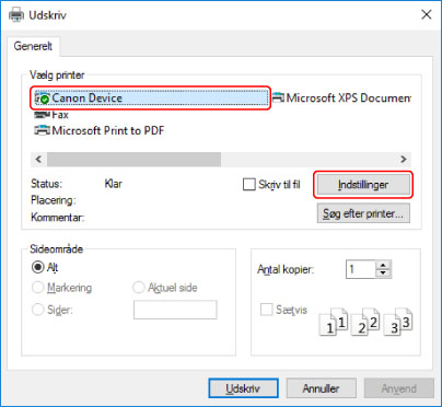 På den enhed, som du bruger, på printskærmen → klik på [Indstillinger], [Printeregenskaber], eller [Egenskaber].