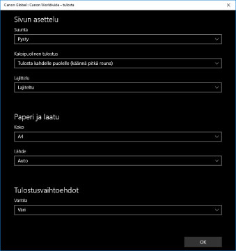 Sovellus on asetettu siten, että Windowsin vakiotulostusasetukset näytetään.